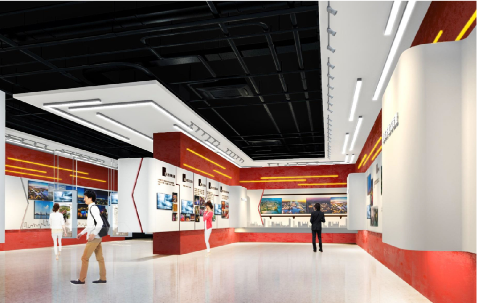 “新時代旗幟 高質量發展”展區中,“在黨的引領下高速向前發展提煉出向前的箭頭”作為設計元素,象征無錫人民在黨中央的領導下不斷學習、不斷創新,高速發展的面貌。展廳集中展示了十八大以來無錫在經濟發展、改革開放、城鄉建設方面的發展。
