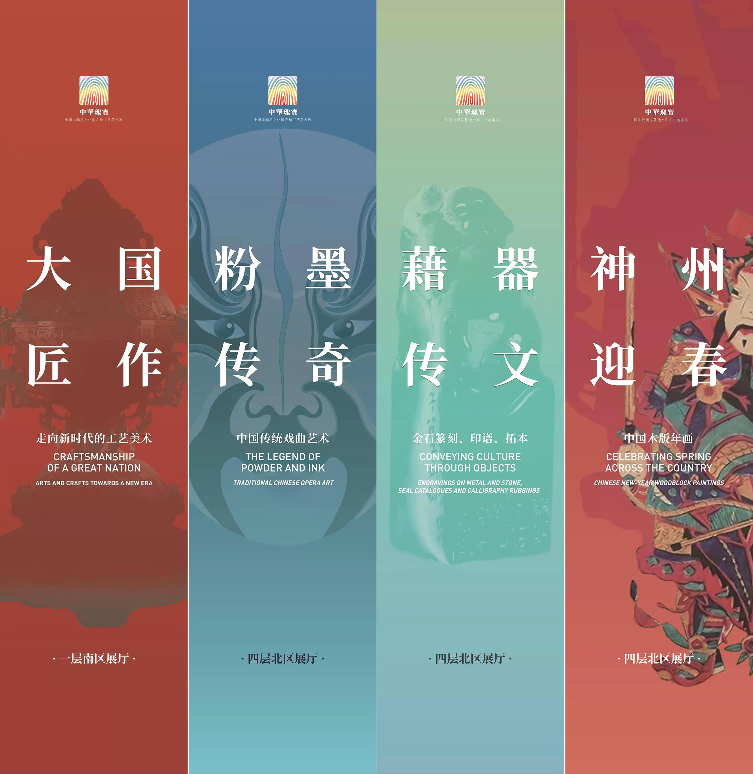 以工藝承匠心、以戲曲演故事、以器物傳文明、以畫像聚人心。金螳螂文化設計團隊在四個不同主題的展覽中分別采用故宮紅、綠色、象牙黃、爐棕為基礎色調,力求在古風古韻中演繹中國工藝美術與非物質文化遺產發展的光輝歷程、講述中華瑰寶傳奇故事。