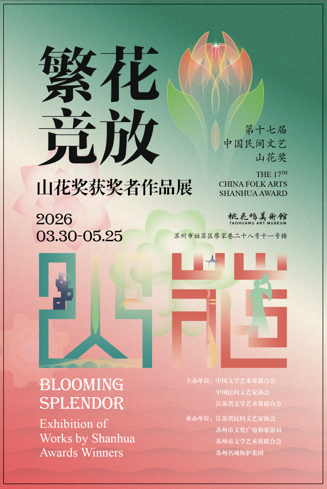 春到江南,藝聚姑蘇 備受矚目的 中國民間文藝最高獎——山花獎 頒獎系列活動在蘇州拉開帷幕 作為核心活動之一 由金螳螂文化設計實施的 “繁花競放——山花獎獲獎者作品展” 在 蘇州市桃花塢美術館 精彩展出 (視頻號:蘇州新聞) 中國民間文藝山花獎是經中宣部批準,由中國文學藝術界聯合會和中國民間文藝家協會聯合主辦的全國性民間文藝最高獎項。 山花獎與電影金雞百花獎、電視金鷹獎、戲劇梅花獎同享榮耀。本屆山花獎是獎項正式落戶蘇州后的首場頒獎盛典,帶來沉浸式民間文藝盛宴。 繁花競放:沉浸式民間文藝盛宴 展覽所在地—— 桃花塢美術館 ,本身即是 桃花塢歷史文化片區保護更新的重要成果 。這座占地面積約7200平方米的專業美術館,設計現代而典雅,與周邊文昌閣、唐寅故居等歷史遺存相映成趣。 桃花塢美術館內,光影交錯,陳設雅致,只為 完美呈現每一件匠心之作 。 本次“繁花競放——山花獎獲獎者作品展”匯集了全國37位山花獎得主(含本屆8位獲獎者)的97組、170件精品力作。 作品涵蓋刺繡、玉雕、漆器、唐卡、剪紙、陶瓷等數十個工藝門類,生動展現手工藝人的精湛技藝與匠心精神。 諸多精彩作品皆在現場靜候,更多驚喜與細節,邀您親臨解鎖、實地賞鑒。 “最憶江南”蘇工蘇作精品展 蘇工蘇作,是江蘇的文化寶藏,積淀著江蘇大地深厚的文化底蘊和文明成果。本次展覽特設“最憶江南——蘇工蘇作精品展”,系統展示37位江蘇藝術家的64組、87件代表性工藝作品,呈現江蘇豐厚的文化積淀和民間工藝的豐碩成果。 這個春天,來蘇州 走進桃花塢美術館 一同感受穿越時空的技藝之美 見證民間文藝 在當代的絢爛綻放